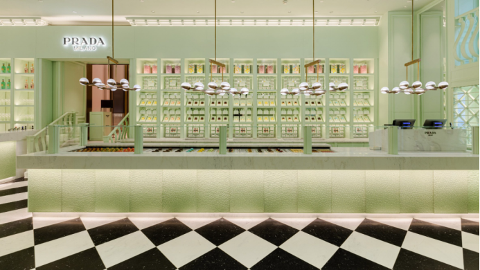 Prada Caffè 店的室内设计借鉴了 1824 年开业的米兰糕点店 Pasticceria Marchesi 的内部装饰,采用淡绿色内饰,搭配绿色天鹅绒座椅,营造出清新、时尚的氛围。Prada Caffè整个室内布局是一个开放式空间,从墙壁、天花板、天鹅绒沙发到扶手椅都巧妙地采用了薄荷绿色,而地板则是重现了位于米兰艾曼纽二世回廊里 Prada 专门店的黑白格地板。