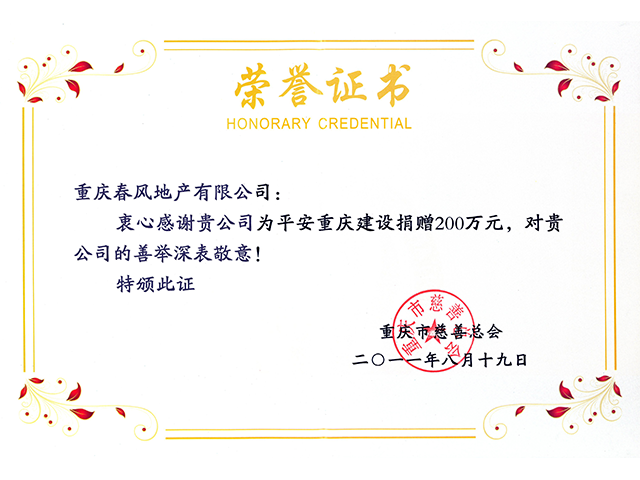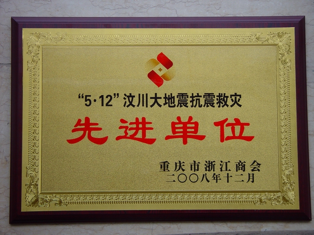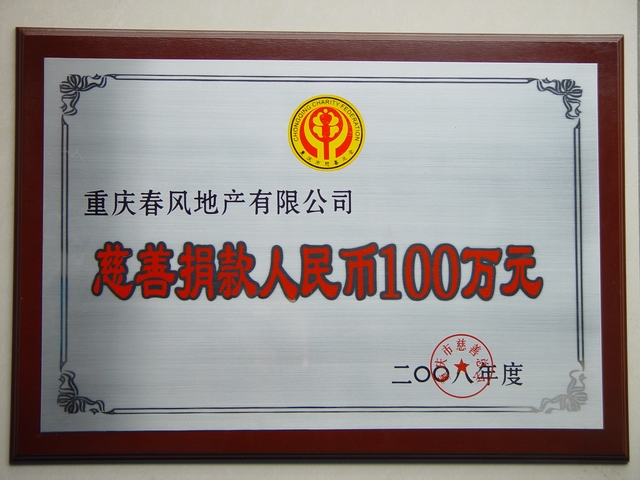春风地产获得重庆市浙江商会授予的5.12汶川大地震抗震救灾“先进单位”称号。