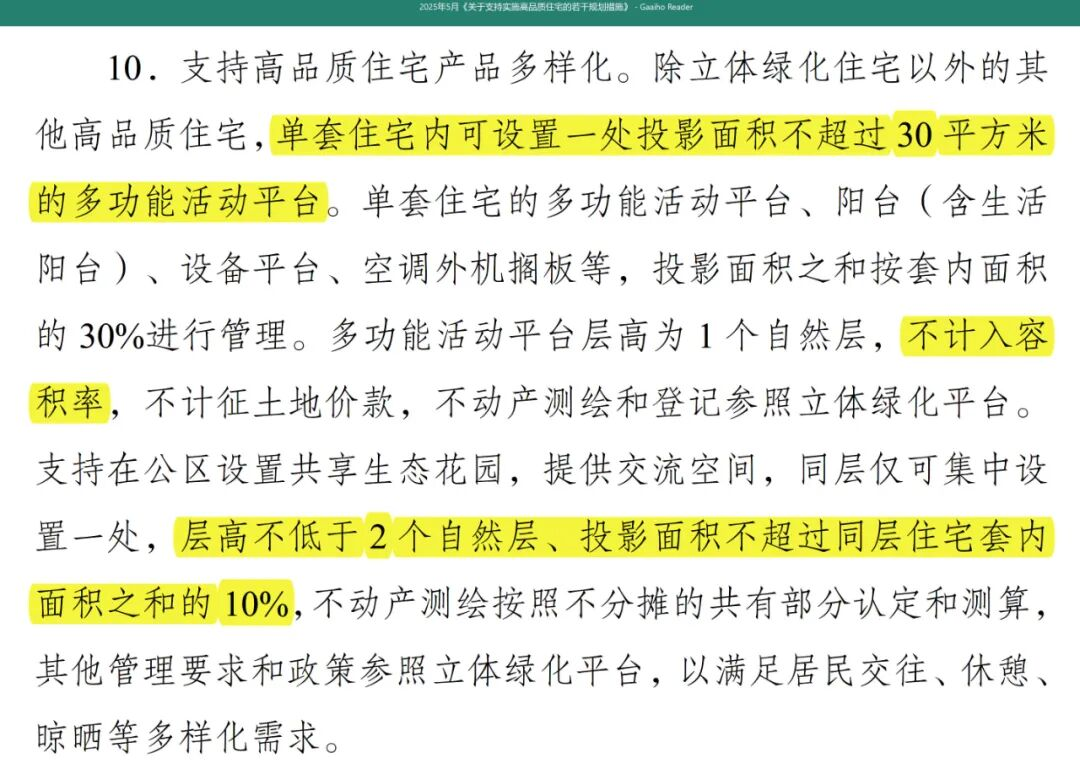 重庆「好房子」核心政策主要是围绕立体绿化和高品质住宅,除立体绿化住宅外的其他高品质住宅,单套住宅内可设置一处投影面积不超过30㎡的多功能活动平台,且多功能活动平台不计容。