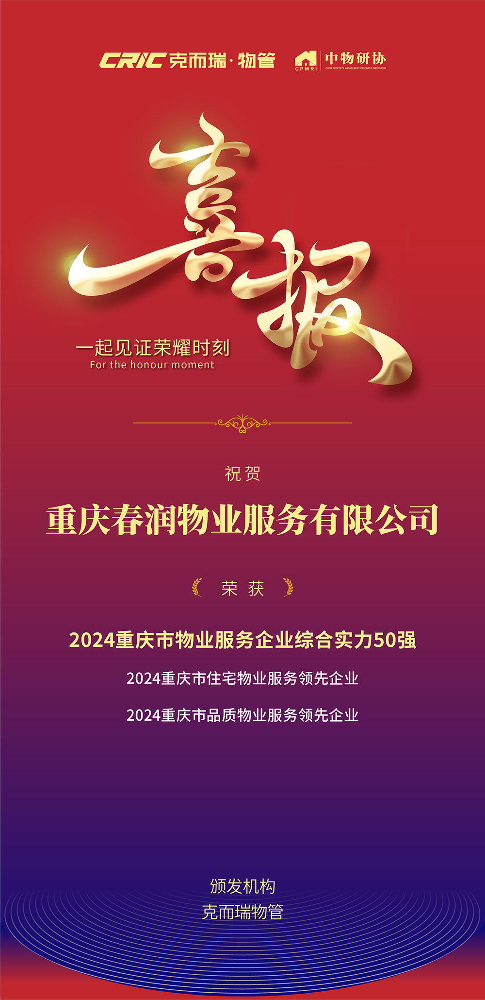 2025年1月10日,在刚刚落幕的以”服务不渝 、高质前行”为主题的 2025 重庆物业服务行业活动暨 2024 年重庆物业服务企业综合实力发布会上,我司凭借卓越的服务品质、创新的管理模式以及全体员工的不懈努力,荣获“2024重庆市物业服务企业综合实力50强”“2024重庆市住宅物业领先企业 ”“2024重庆市品质物业服务领先企业 ”三项殊荣。这是行业对我们的高度认可,更是我们砥砺前行的强大动力。