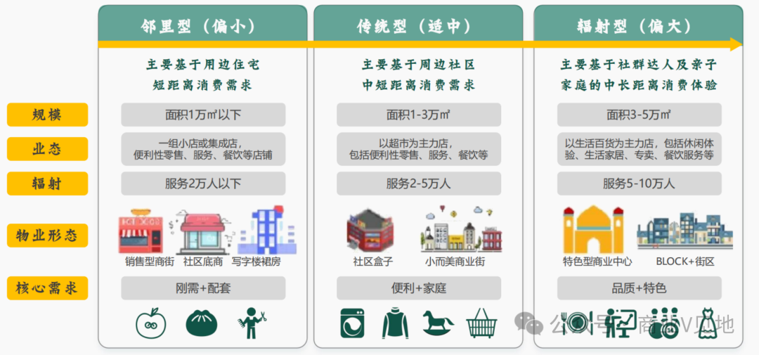 此外,根据社区商业的规模、业态、辐射范围、物业形态等维度,可以对社区商业进行更加精准的细分,包括邻里型(1万㎡以下,一组小店或集成店、传统型(1-3万㎡,社区盒子或小型商街形式)、辐射型(3-5万㎡,BLOCK商街等形式)。