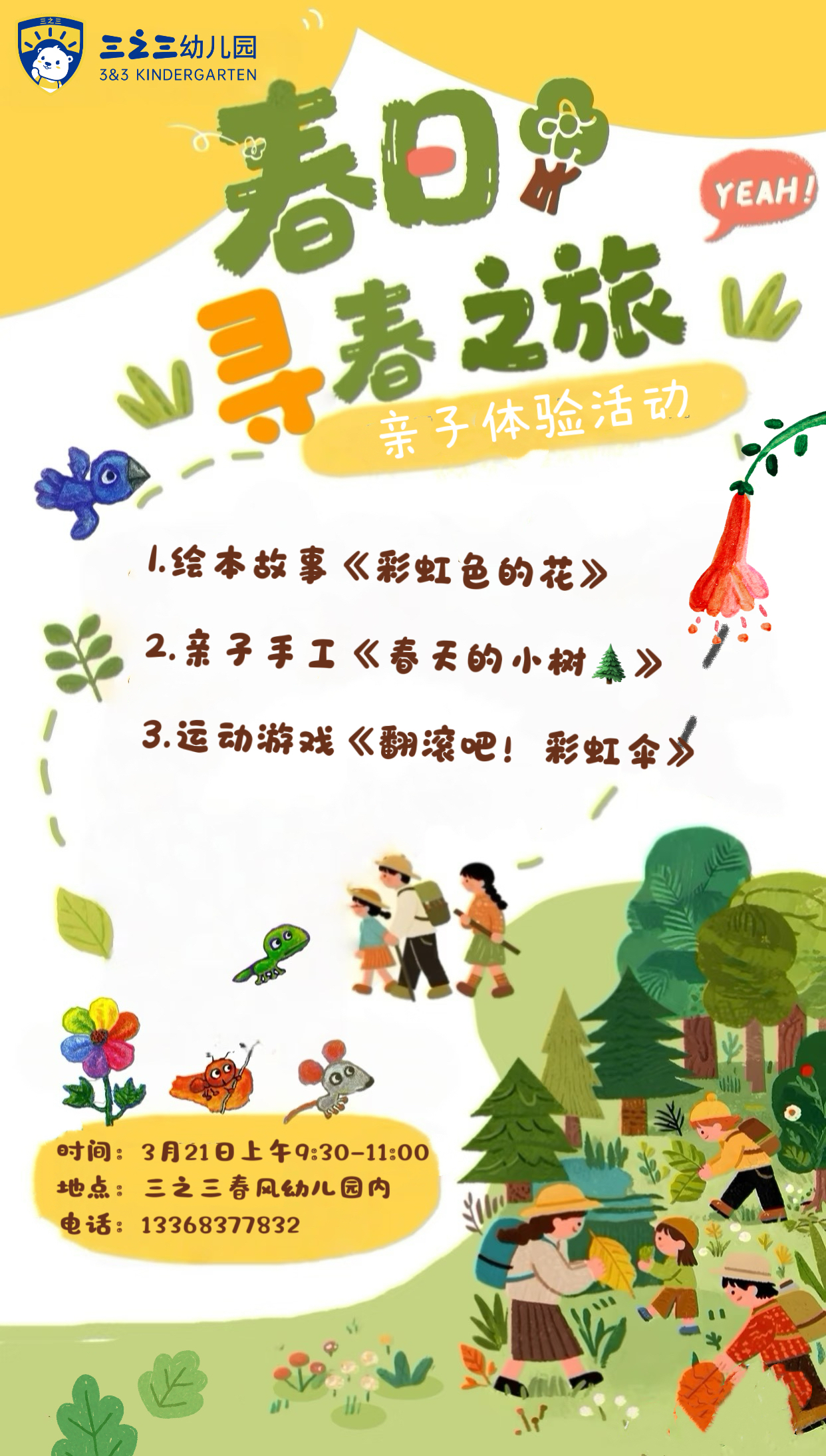 活动流程: 1️⃣入园签到✍️ 2️⃣绘本故事 3️⃣亲子手工 4️⃣运动游戏 温馨提示: 1、3月21日(星期六)上午9:30-11:00(9:10开始签到) 2、请根据小朋友的需要准备水壶 亲子体验课主要为了让小朋友感受幼儿园的课程,了解幼儿园的情况,为宝宝入园做准备 本次活动专为未上幼儿园2-3岁幼儿免费提供体验课,请家长们抓紧接龙报名哦 欢迎大家来电咨询、入园参观
